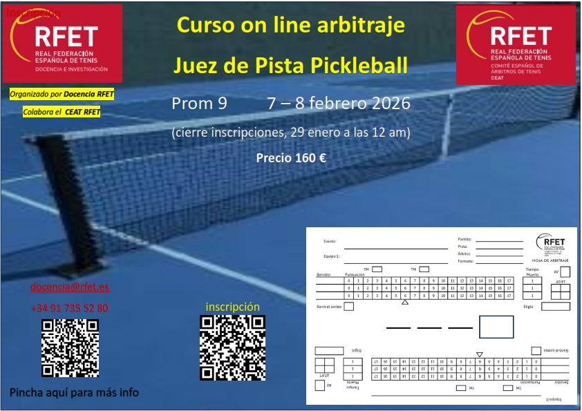 El CGAT informa del primer curso de Juez de Pista Pickleball RFET 2026 con formato on line para el 7 y 8 de febrero.